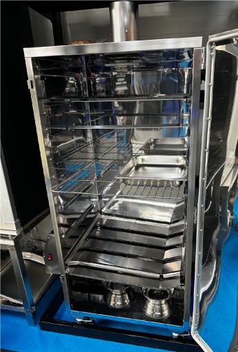 Wędzarnia BBDST-150 wyposażono w nową misę odgrodową, usprawniającą przepływ powietrza oraz odprowadzanie tłuszczy. To bardzo ważny element wędzarni umieszczony w dolnej części komory nad grzałką generatora dymu. Tu gromadzą się skropliny powstające w wyniku oddziaływania wysokich temperatur na wędzone produkty. Konstrukcja misy odgrodowej umożliwia odprowadzenie tłuszczu do misy umieszczonej poniżej. Piętrowy układ otworów misy gwarantuje prawidłowy przepływ dymu wędzarniczego w całej komorze wędzarni.