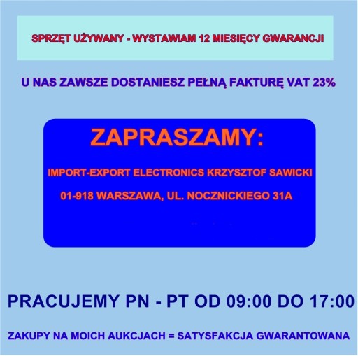 Oferujemy sprzęt kompletny i działający w normalnymi śladami użytkowania jak to bywa przy sprzęcie używanym.