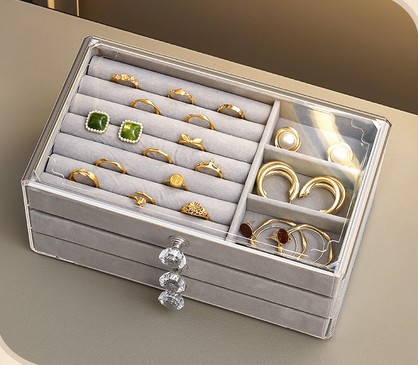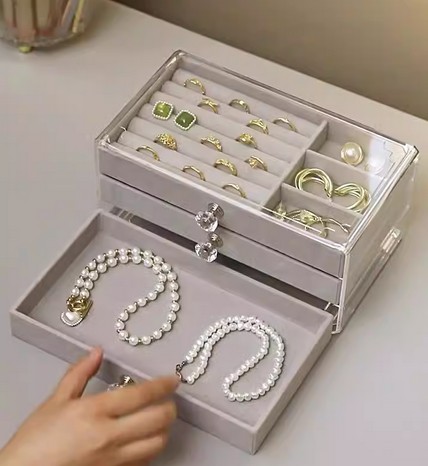 Organizer posiada 3 wysuwane poziome szufladki, wyścielone miłym w dotyku welurowym materiałem, w których można umieścić drobną biżuterię taką jak pierścionki, zawieszki czy spinki.