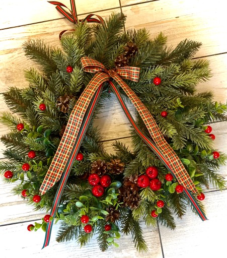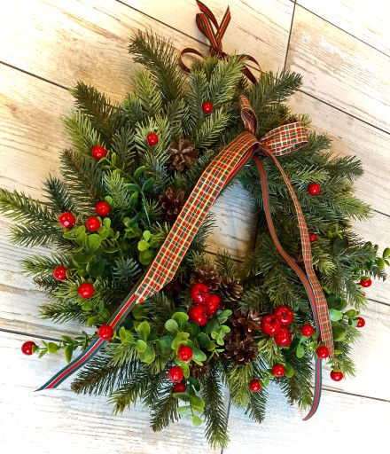 Przedmiotem sprzedaży jest przepiękny, ręcznie wykonany, Ok. 40-45cm, wianek bożonarodzeniowy na drzwi (i nie tylko!) - efektowna i trwała ozdoba, która posłuży na lata.
