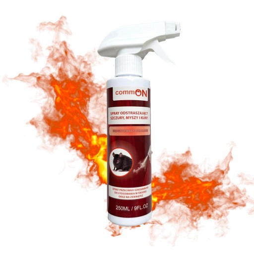 COMMON SPRAY NA KUNY to gotowy do użycia aerozol skutecznie odstraszający kuny. Może być stosowany w pomieszczeniach (np. garaże, strychy, piwnice), w pojazdach i na zewnątrz budynków. Przy sprzyjających warunkach pogodowych działa aż do 8 tygodni.