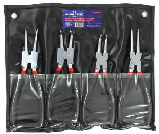Zestaw dostosowany do pracy z pierścieniami wewnętrznymi i zewnętrznymi. Posiada szczypce z wygiętymi oraz prostymi końcówkami oraz 2 typy tych zabezpieczeń: wewnętrzne (rozprężne w środku tulei) i zewnętrzne (zaciskowe, na zewnątrz wałka). Szczypce są wykonane z trwałej i wytrzymałej stali chromowo-wanadowej, posiadają rączki pokryte gumą. To doskonałe narzędzia do montażu i demontażu pierścieni sprężystych.