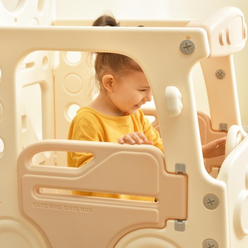 Zestaw zawiera autobus, długą zjeżdżalnię, obręcz do koszykówki i pasującą piłkę do koszykówki. Twoje dzieci mogą usiąść w autobusie i poczuć się jak prawdziwy kierowca autobusu.