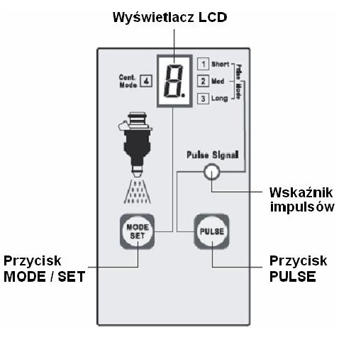 Sposób uzycia:1. Wyłączyć silnik pojazdu.2. Podłączyć czarny klips testera do ujemnego bieguna (-) akumulatora, a czerwony klips do dodatniego (+) bieguna akumulatora.3. Zlokalizować wtryskiwacz, który chcemy sprawdzać i odłączyć połączenia elektryczne od tego wtryskiwacza i podłączyć 2 konektorowe końcówki wyjściowe (na których będzie pojawiała się seria impulsów generowanych przez tester) do terminali badanego wtryskiwacza.4. Wciskać przycisk „MODE SET” dla wyboru odpowiedniej serii impulsów, wyświetlacz będzie wskazywał numer aktualnie wybranej serii.Do dyspozycji mamy 4 rodzaje generowanych przez tester impulsów:Seria 1: Tester generuje 1 impuls prostokątny o szerokości ok. 250ms, amplituda ok. 1V.Seria 2: Tester generuje 50 impulsów o szerokości ok. 7ms, wypełnienie impulsu (DUTY) 25%, częstotliwość 33Hz, amplituda ok. 1V.Seria 3: Tester generuje 100 impulsów o szerokości ok. 3,5ms, wypełnienie impulsu (DUTY) 25%, częstotliwość 66Hz, amplituda ok. 1V.Seria 4: Tester generuje serię ciągłą impulsów o szer. ok. 7ms, wypełnienie impulsu (DUTY) 25%, częstotliwość 33Hz, amplituda ok. 1V