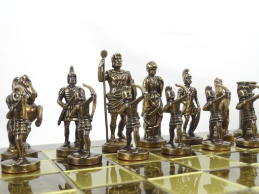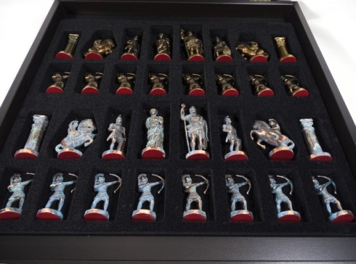 Szachy inspirowane elementami mitologii greckiej - piony to łucznicy, król i hetman - bogowie greccy, goniec- rycerz w rynsztunku, skoczek - jeździec, wieża - kolumna grecka.