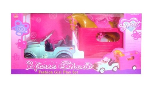 Duże auto z przyczepą do transportowania zwierząt. W zestawie znajduję się też koń z pełnym wyposażeniem jeździeckim oraz kilkoma akcesoriami do jego pielęgnacji. Całość spakowana jest w kartonowe pudełko z przezroczystym okienkiem.