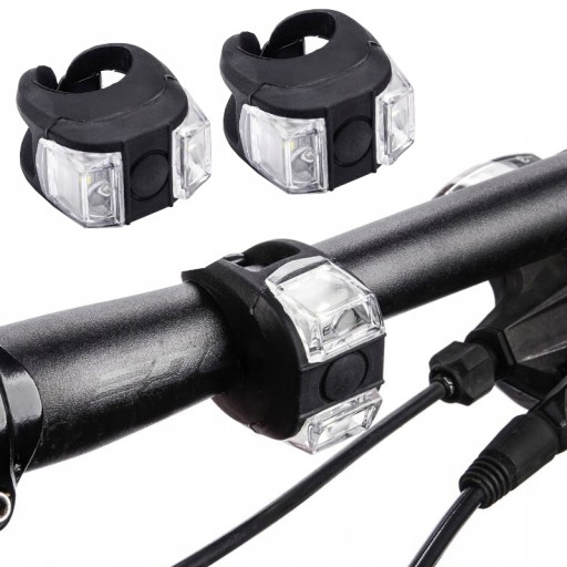 Zestaw lampek rowerowych świecących bardzo jasnym światłem. Z przodu kolorem białym, z tyłu kolorem czerwonym.