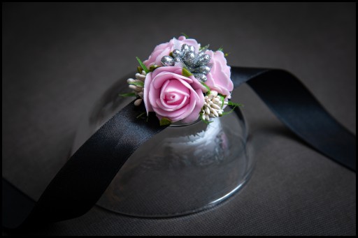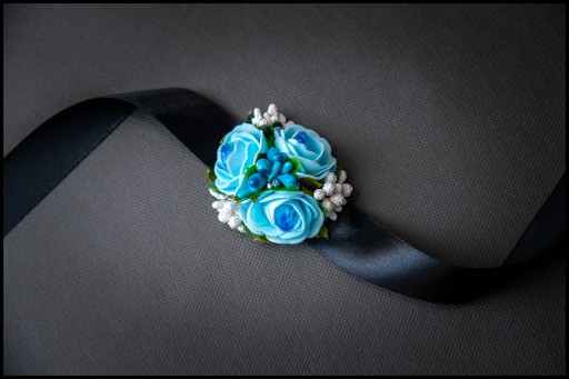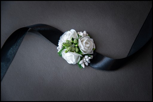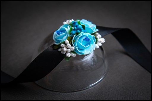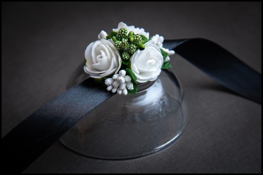 Bukieciki wykonane na czarnej atłasowej wstążce do zawiązania na rękę.