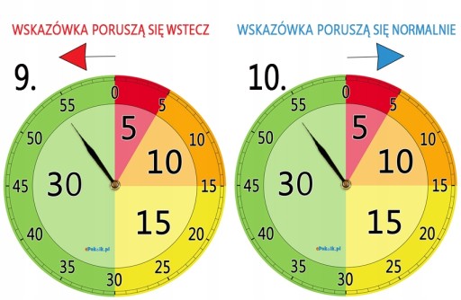Zegar posiada jedną wskazówkę odmierzającą czas wstecz - wskazówka porusza się do tyłu. Pozwala zrozumieć dzieciom długość upływającego czasu. Ma za zadanie zilustrować specjalną tarczą przedział czasowy 5-, 10-, 15-, 30- minutowy. Podczas pracy określamy kolorem czas na wykonanie zadania , ustawiając ręcznie wskazówkę na końcu odpowiedniego koloru.