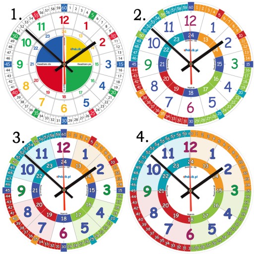 Zegary edukacyjne posiadają dwa rodzaje podziału pól (najczęściej różnokolorowych) wyznaczajacych godziny :