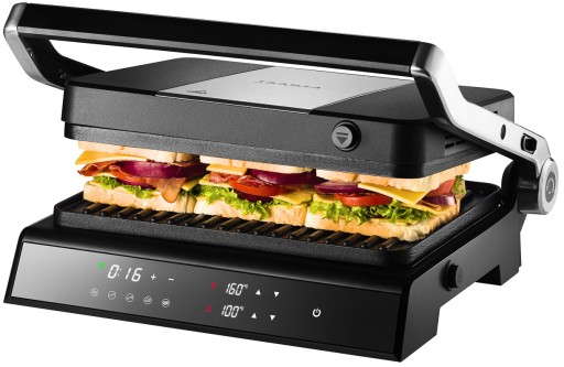 ▶ Zaletą tego urządzenia jest możliwość otwarcia płyt pod kątem 180°, co zapewnia wygodę przy smażeniu i pieczeniu warzyw, mięsa, ryb i innych potraw na obydwu płytach jednocześnie.