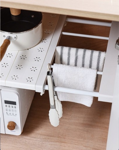 Teleskopowa półka do przechowywania jest bardzo wygodna w codziennym życiu, rozciągają się w zakresie 41-52 cm. Taka półka pozwala maksymalnie wykorzystać wolna przestań w Twoim mieszkaniu.