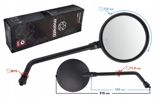 Czarne matowe lusterka o okrągłym kształcie. Mocowane są na solidnym metalowym uchwycie o średnicy gwintu 10 mm.