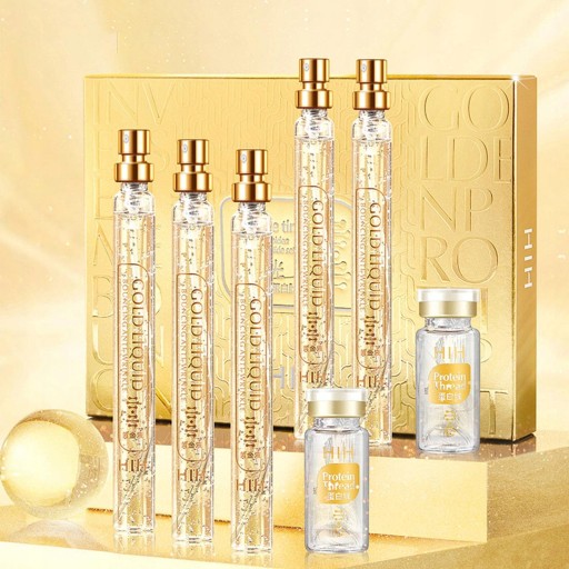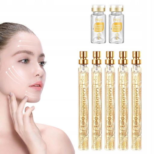 Zastosowanie: po oczyszczeniu nanieść równomiernie złoty płyn na twarz, następnie przyklej linię proteinową razem ze strukturą skóry na twarz i czoło, następnie nanieść złoty płyn na pozycję linii proteinowej i delikatnie wmasować, aż do wchłonięcia.