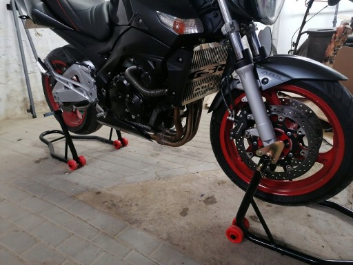 Stojak posiada regulowane adaptery. Wysokość tego modelu to 46 cm, a długość 80 cm. Doskonale sprawdzi się w niewielkich pomieszczeniach, w których liczy się każdy kawałek przestrzeni. Wyposażony jest w podwójne, dodatkowo wzmocnione koła. To doskonały sposób na przechowanie motocyklu lub prace serwisowe! Zestaw obejmuje dwie sztuki.