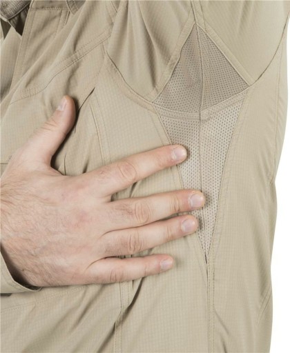Koszula zaprojektowana z myślą o noszeniu w cieplejszych porach roku lub w rejonach gdzie wysoka temperatura nie jest rzadkim zjawiskiem. Zrobiona z technicznego materiału poliestrowego, w dotyku przypominającego cienką bawełnę. Odprowadza wilgoć z ciała i schnie ekspresowo. Dzięki stonowanej kolorystyce będzie stanowić doskonałe uzupełnienie zarówno outdoorowego jak i miejskiego ubioru. Na listwie guzikowej została wszyta niewielka szlufka, na której można wygodnie zawiesić okulary.