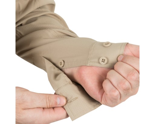 Koszula zaprojektowana z myślą o noszeniu w cieplejszych porach roku lub w rejonach gdzie wysoka temperatura nie jest rzadkim zjawiskiem. Zrobiona z technicznego materiału poliestrowego, w dotyku przypominającego cienką bawełnę. Odprowadza wilgoć z ciała i schnie ekspresowo. Dzięki stonowanej kolorystyce będzie stanowić doskonałe uzupełnienie zarówno outdoorowego jak i miejskiego ubioru. Na listwie guzikowej została wszyta niewielka szlufka, na której można wygodnie zawiesić okulary.