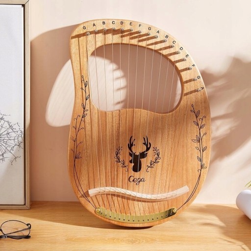 LYRE HARP: Lirowa harfa wyrzeźbiona z kawałka drewna mahoniowego o wysokiej twardości i gęstości jest wystarczająco mocna, aby zachować jej ton i uniknąć nacisku struny na drewno Instrument ma ciepły głos o przyjemnym brzmieniu