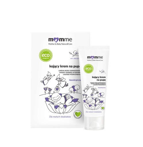 Kojący krem na pupę od marki MomMe. Dzięki stuprocentowo naturalnej formule produkt doskonale nadaje się do pielęgnacji nawet najbardziej wrażliwej skóry. Krem przeznaczony jest do pielęgnacji okolic pieluszkowych. Hipoalergiczny, bezzapachowy. Charakteryzuje się działaniem regenerującym, nawilżającym, przeciwzapalnym oraz ochronnym. Łagodzi podrażnienia. chroniące przed odparzeniami.