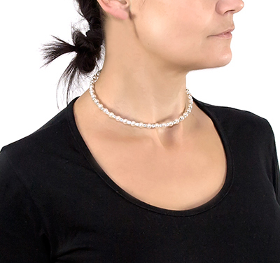 Sprężysta kolia wykonana w posrebrzanej oprawie i ozdobiona kryształowymi cyrkoniami pięknie mieniącymi się w świetle na przemian z perełkami.