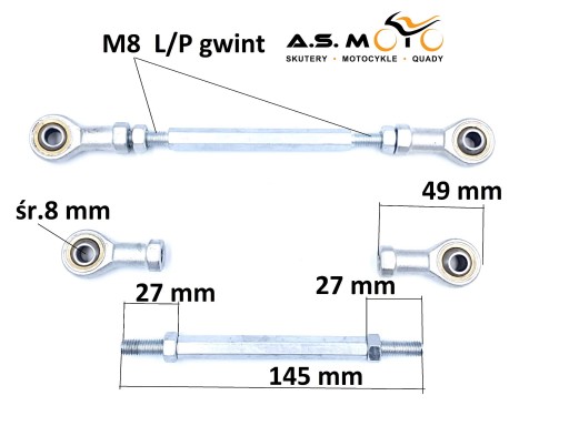 - Gwint drążka kierowniczego: M8 gwint prawy oraz gwint lewy
