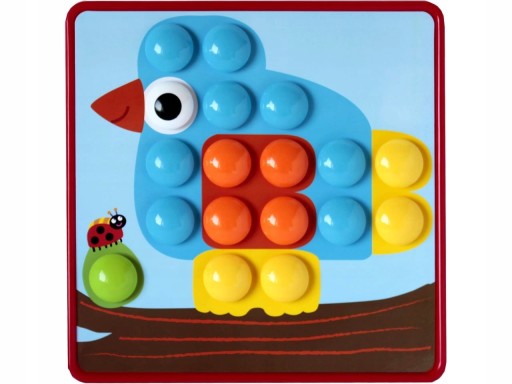 45 guziczków, podstawka, pokrywka z otworami oraz 12 kolorowych, wymiennych obrazków wystarczy by zająć dziecko na długie chwile.