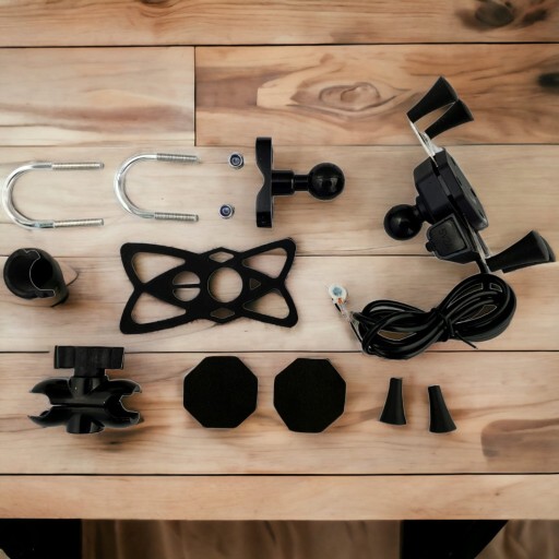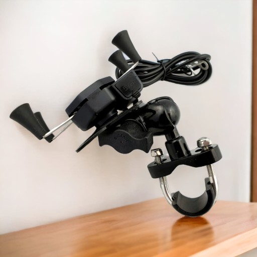 - Uchwyt typu RAM z 4 ramionami zakończonymi gumowymi chwytakami, ładowarką USB i kablem: Główny element zestawu - solidny uchwyt z czterema ramionami, które posiadają gumowe chwytaki zapewniające pewne trzymanie urządzenia. Dodatkowo zawiera ładowarkę USB oraz kabel 150cm