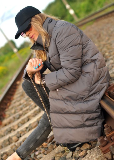 ZIMOWY DŁUGI PŁASZCZ PIKOWANY DWUSTRONNY W KOLORZE SZARO-CZARNYM;