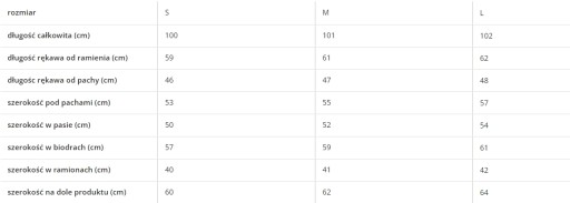 - Wymiary płaszcza znajdziesz w osobnej tabeli rozmiarów lub w parametrach na górze;