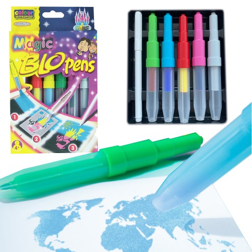 Dmuchane flamastry to specjalne markery aerograficzne, które pozwalają na stworzenie cudownych prac. Specjalny tusz w nich zawarty, po dmuchnięciu w marker, pozostawia kolorową mgiełkę na papierze. Stosując połączenia różnych kolorów można tworzyć przepiękne gradientowe wzory. Markery to źródło niekończącej się zabawy! Oferują świetne zestawienia kolorystyczne. Dołączone oryginalne szablony w połączeniu z własnymi pomysłami gwarantują doskonałą zabawę.