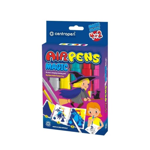 Opakowanie zawiera zestaw dmuchanych flamastrów AIRPENS Centropen Magic. Składa się z: – 4 kolorowe dmuchane mazaki – 1 magiczny dmuchany mazak i 1 pisak, który zmienia kolor rysunku wykonanego pozostałymi mazakami – 8 różnych szablonów