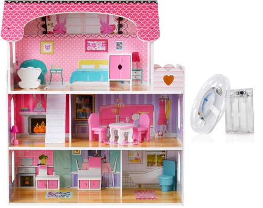 DUŻY DOMEK DLA LALEK DREWNIANY + MEBLE + OŚWIETLENIE LED