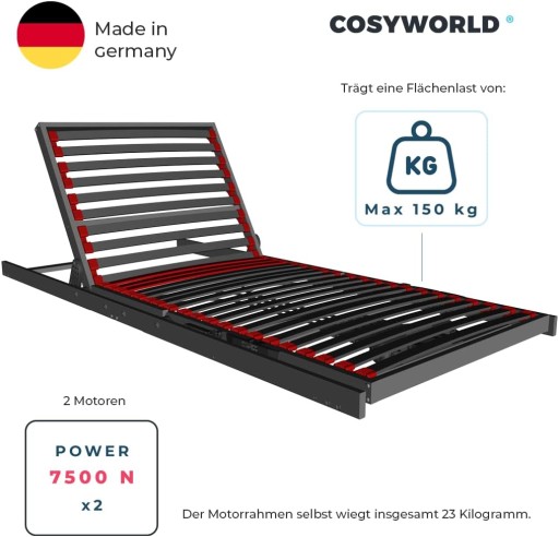 COSYWORLD Cosy2Go stelaż 100 x 200 cm, regulowany elektrycznie – pasuje do każdego łóżka 100 x 200 cm lub łóżka podwójnego 200 x 200 cm – bardzo płaski, składany, nadaje się do każdego materaca – Made