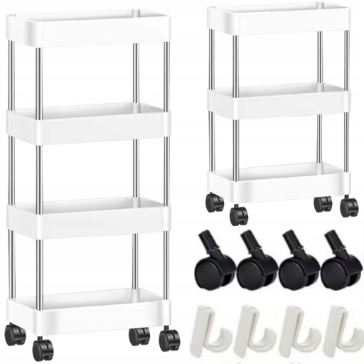 ✅Posiada kółka dzięki czemu można ją szybko wysunąć lub przesunąć tam gdzie w danej chwili jej potrzebujemy. (W zestawie 4 półki). Dodatkowo regał posiada 4 haczyki na których można zawiesić ręczniki lub ściereczki