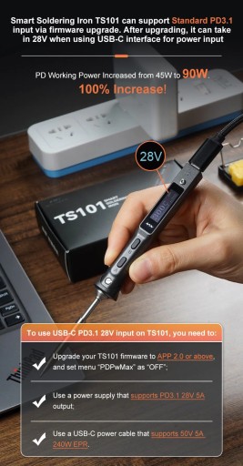 Smart Lutownica TS101 to ulepszona wersja Mini Lutownica TS100. Kontroler TS101 posiada nowoczesny i wytrzymały wygląd oraz większy wyświetlacz OLED o rozdzielczości 128*32 piksele, umożliwiający wyświetlanie większej ilości danych dotyczących temperatury grzania. Klasyczne przyciski A i B pozwalają na korzystanie z TS101 w taki sam sposób jak TS100, zmniejszając koszt nauki obsługi dla użytkownika. Koniec kontrolera służący do mocowania końcówki lutowniczej jest wyposażony w śrubę kulową, co eliminuje konieczność odkręcania śruby sześciennej przed włożeniem lub wyjęciem końcówki. Dodatkowym, praktycznym akcesorium do TS101 jest antypoślizgowy kapturek, przypominający głowę kota. Może on służyć jako prosty podstawek, zapobiegający przewracaniu się lutownicy, a także zapewniać antypoślizgowe trzymanie oraz usuwanie końcówki lutowniczej. Smart Lutownica TS101 umożliwia podwójne zasilanie DC i PD. Popularny interfejs DC5525 został rozbudowany do zakresu od DC 9-24V (aż do 65W). Interfejs USB-C zastąpił oryginalny interfejs Micro USB, służący do aktualizacji oprogramowania oraz obsługujący standardowe zasilanie PD o mocy do 45W. Zakres regulacji temperatury został optymalizowany i wynosi 50-400°C, co pozwala na zastosowanie lutownicy w różnorodnych scenariuszach. TS101 oferuje bardziej rozbudowane menu z opcjami ustawień oraz nowością jest funkcja „Boost”, pozwalająca na szybkie podgrzewanie w krótkim czasie, sprostając potrzebom spawania specjalistycznego. TS101 i TS100 korzystają z tych samych końcówek lutowniczych, dlatego posiadane już końcówki TS100 mogą być dalej używane z tą ulepszoną wersją lutownicy. Główne parametry: Zakres napięcia i mocy: DC 9-24V 9-65W (MAX), PD3.0 9-20V 9-45W (MAX), PD3.1 9-28V 9-90W (MAX) (po aktualizacji oprogramowania) Maksymalna temperatura pracy w otoczeniu: 40°C Stabilność temperatury: ±2% Odporność końcówki lutowniczej na uziemienie: <2Ω Zakres temperatury: 50°C~400°C (MAX) Specyfikacja produktu: Wyświetlacz: Ekran OLED Długość części kontrolera: 98mm Interfejs zasilania: Port USB typu C Waga netto: 33g (Część kontrolera + Końcówka) Certyfikacja: Zgodność z certyfikacjami UE CE FCC UKCA Interfejs transferu danych: Port USB typu C