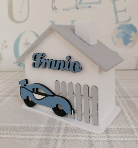 Drewniana, ręcznie malowana skarbonka w kształcie domku, będzie idealnym prezentem dla każdego dziecka na różne okazje. Z przodu skarbonki znajduje się płotek i ręcznie malowany dekor. Na górze w widocznym miejscu widnieje drewniany napis z imieniem dziecka.