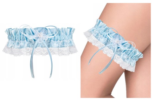 Podwiązka ozdobiona jest podwójną biało-niebieską kokardką i kwiatkiem z białych perełek.