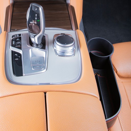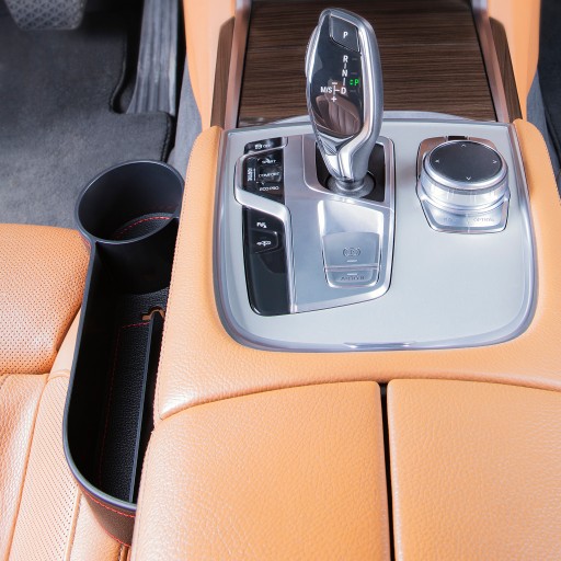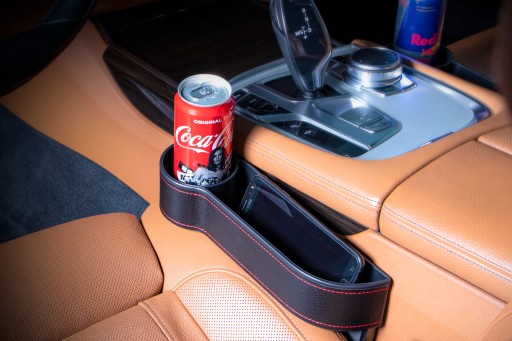 Samochodowy schowek szczelinowy z przegródkami i uchwytem na kubek przeznaczony do montażu pomiędzy fotelem kierowcy, a skrzynią biegów. Wyjątkowo ładne obicie w czarnym kolorze to pewność wpasowania się produktu do każdego wnętrza samochodu, a czerwona nić podkreśla wyjątkowy i nowoczesny design. W przedniej części zamontowany został uchwyt na napoje (kubek, szklankę, puszkę czy butelkę).