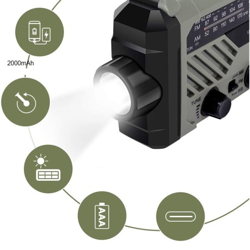 🍀 4-kierunkowe źródła zasilania: radio pogodowe z 4 opcjami zasilania zapasowego. 1️⃣ Panel słoneczny: do generowania energii dla wewnętrznego akumulatora litowo-jonowego z bezpośrednim światłem słonecznym; 2️⃣ Korba ręczna: do ładowania radia, gdy nie jest dostępne inne źródło prądu; 3️⃣ Wejście USB 5 V: oszczędzaj czas pracy baterii, gdy zasilanie jest dostępne; 4️⃣ 3 baterie AAA (nie wchodzą w zakres dostawy) jako rozwiązanie awaryjne zasilania