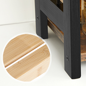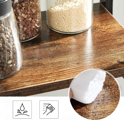 Regał wykonany został z drewna bambusowego oraz płyty meblowej, wykończony ochronną powłoką lakierniczą, aby chronić przed wilgocią oraz zabrudzeniami. Drewno bambusowe charakteryzującego się wysoką odpornością na wilgoć.