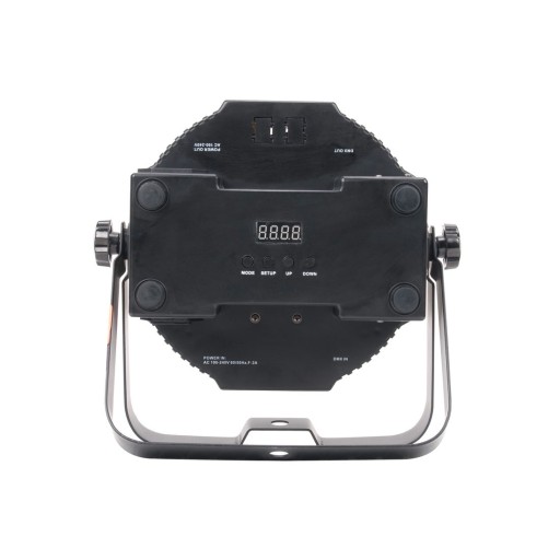 - Wejście/Wyjście zasilania oraz DMX są umieszczone na panelach bocznych by móc ustawić urządzenie bezpośrednio na podłożu