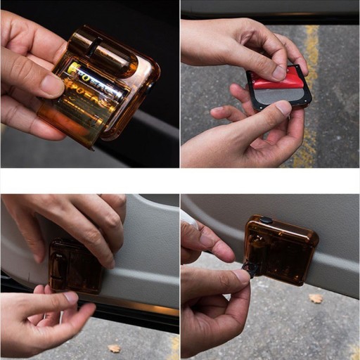 Cena dotyczy kompletnego zestawu dwóch rzutników LED z wybranym logo, czujnikami magnetycznymi otwarcia/zamknięcia drzwi oraz taśmą montażową. Zestaw nie zawiera baterii AAA