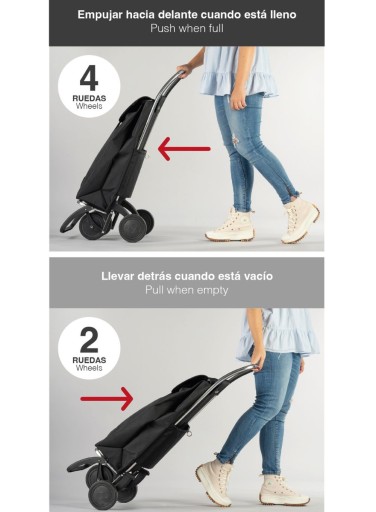 - Wygodna funkcja pchania lub ciągnięcia: 2 lub 4 kółka w zależności od potrzeb – dodatkowe koła można schować lub wysunąć bez nadmiernego wysiłku, nie trzeba się schylać
