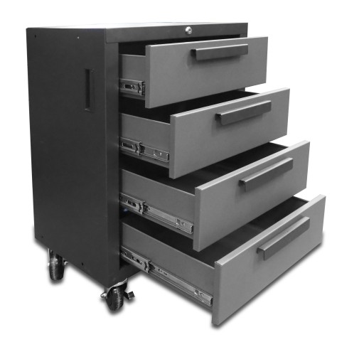 Szuflady, umieszczone na łożyskowanych prowadnicach o imponującym udźwigu 45 kg każda, ułatwiają porządkowanie narzędzi i szybki dostęp do potrzebnych akcesoriów.