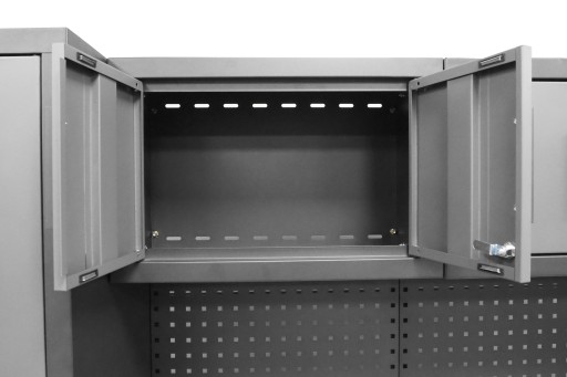 - Konstrukcja szafy jest pełna i spawana, co zapewnia solidność i trwałość. Składa się z trzech podwieszanych szafek, z każdą o imponującej ładowności 68 kg, co pozwala przechowywać w nich różnorodne narzędzia i akcesoria.