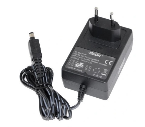Stabilizowany zasilacz sieciowy. Napięcie zasilania: od 200 V do 240 V. Napięcie wyjściowe: 12 V DC. Prąd wyjściowy: 1,25 A. Posiada wtyk DC 5,5 / 2,5 mm.