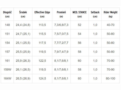- Rozmiary: 148 - wiązania M (25.0-27.0), 151 - wiązania M (25.0-27.0), 154 - wiązania M (25.0-27.0), 157 - wiązania M (25.0-27.0), 161 - wiązania L (27.5-29.0), 159W - wiązania L (27.5-29.0), 164W - wiązania L (27.5-29.0)