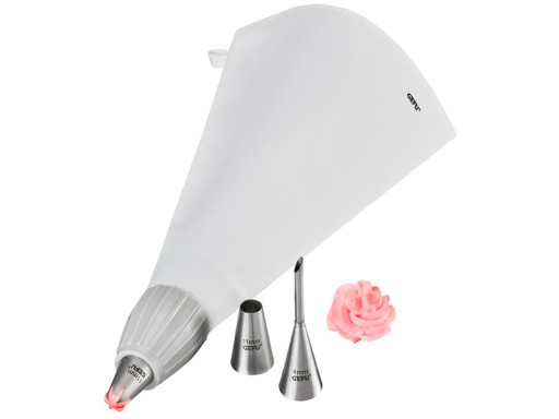 Rękaw do dekoracji ciast GEFU Decore G-14330 do napełniania foremek do muffinów lub napełniania pączków. Wykonany z powlekanej, gotowanej bawełny. W zestawie 3 końcówki wykonane z wysokiej jakości stali nierdzewnej. Końcówki można łatwo wymienić. Długość 39 cm, szerokość 20.3 cm, wysokość 5.1 cm.