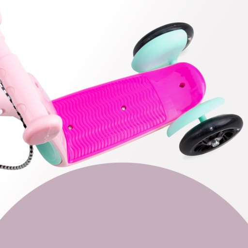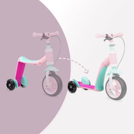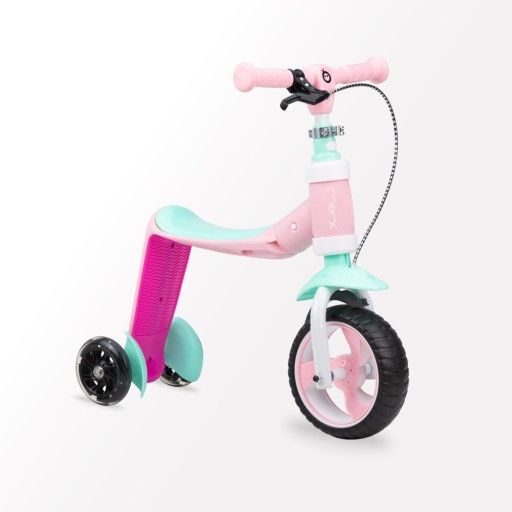 Dzięki odpowiedniemu rozłożeniu kół i wyważeniu hulajnogi, pojazd jest doskonale zbalansowany. Szeroko rozmieszczone tylne koła sprawiają, ze pojazd jest stabilny, co minimalizuje możliwość upadku. Jest to szczególnie ważne w przypadku Dzieci, które dopiero zaczynają swoją przygodę z hulajnogą. Kiedy Dziecko znudzi się jazdą na hulajnodze, jednym ruchem ręki możesz zamienić ją w jeździk.