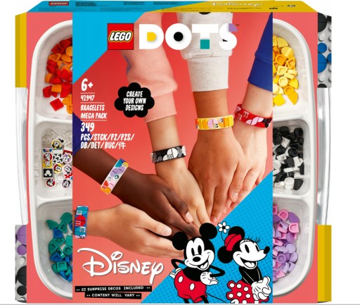 - Projektuj, noś, chwal się — uszczęśliw małego wielbiciela rękodzieła dzięki zestawowi LEGO® DOTS ǀ Disney Miki i przyjaciele — megazestaw bransoletek (41947). Zabawa zaczyna się od razu po otwarciu tacek